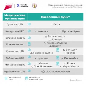 До конца текущего года все новые медицинские объекты должны быть не только возведены, но и пройти лицензирование, а значит, в них уже начнется прием пациентов. Работы будут вестись в 21 районе области: Арбажском, Афанасьевском, Белохолуницком, Верхнекамском, Верхошижемском, Вятскополянском, Зуевском, Кикнурском, Кильмезском, Котельничском, Куменском, Лебяжском, Малмыжском, Мурашинском, Омутнинском, Оричевском, Санчурском, Слободском, Уржумском, Фаленском и Юрьянском. Полный перечень населенных пунктов, где в текущем году планируется возведение медицинских объектов, – в нашей инфографике.