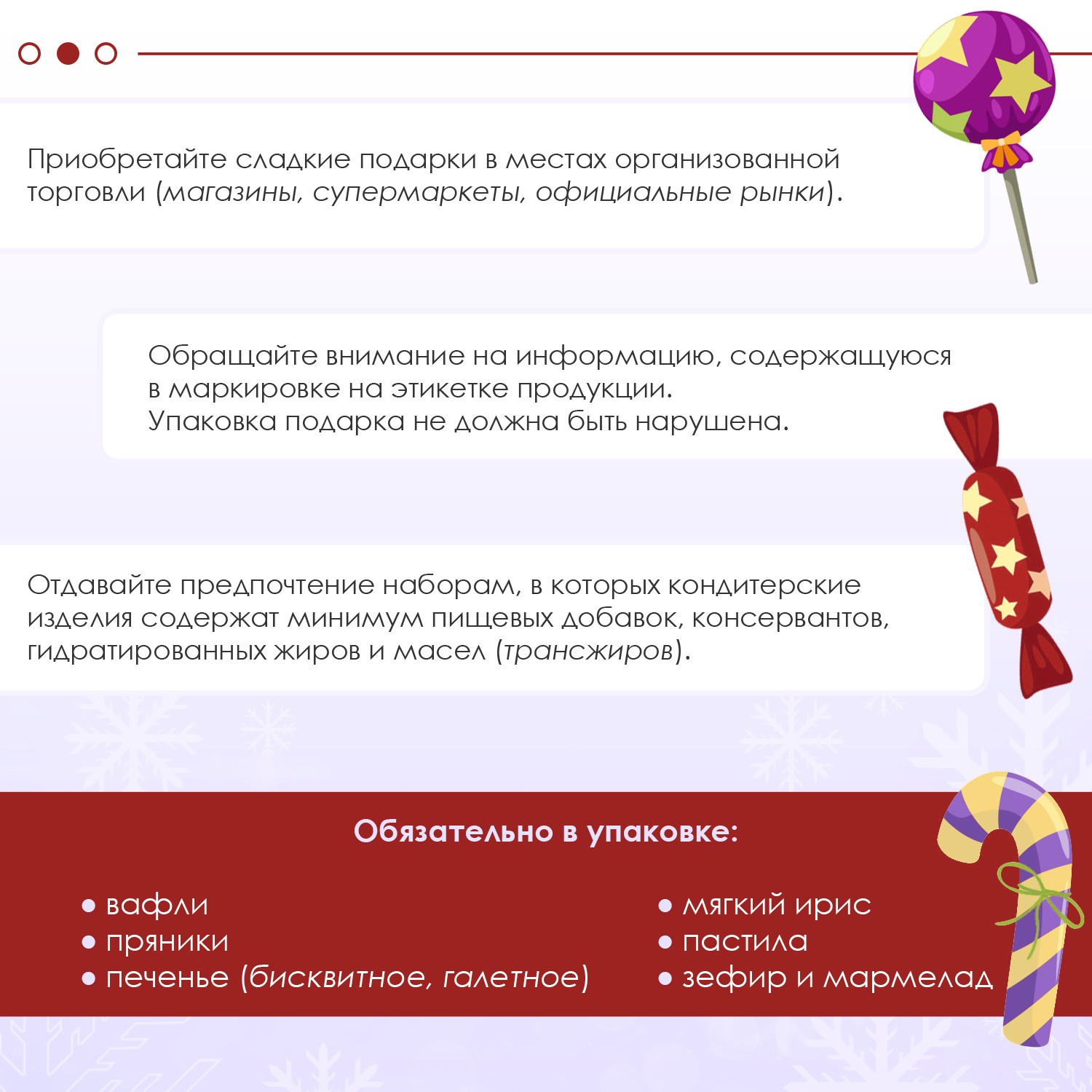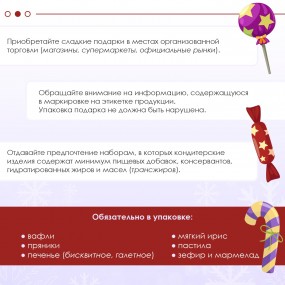 Сладкие новогодние подарки рекомендуется приобретать в местах организованной торговли (магазины, супермаркеты, официальные рынки).