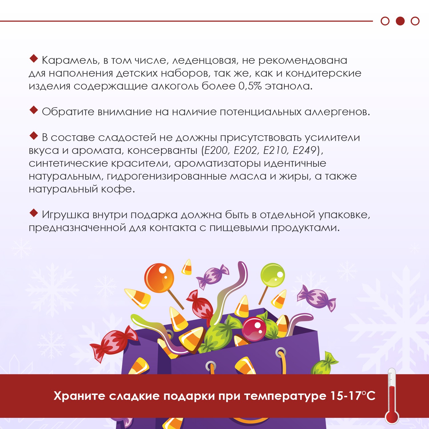 Допускается содержание натуральных красителей и ароматизаторов. Внутри подарка вместе с кондитерскими изделиями может находится игрушка, она должна быть в отдельной упаковке, предназначенной для контакта с пищевыми продуктами. Важно помнить о возрастных ограничениях и технике безопасности.