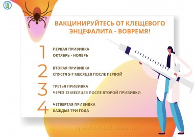 Прививки от клещевого вирусного энцефалита проводятся по 2 схемам - основной или экстренной. Основная схема вакцинации включает 2 прививки, которые необходимо поставить в осенне-весенний период (ноябрь-март) с интервалом, в зависимости от вакцины от 1 до 7 мес. Затем через 5-12 мес. (в зависимости от вакцины) необходимо поставить 3 прививку (она называется первая ревакцинация). Три прививки – это законченный курс вакцинации.